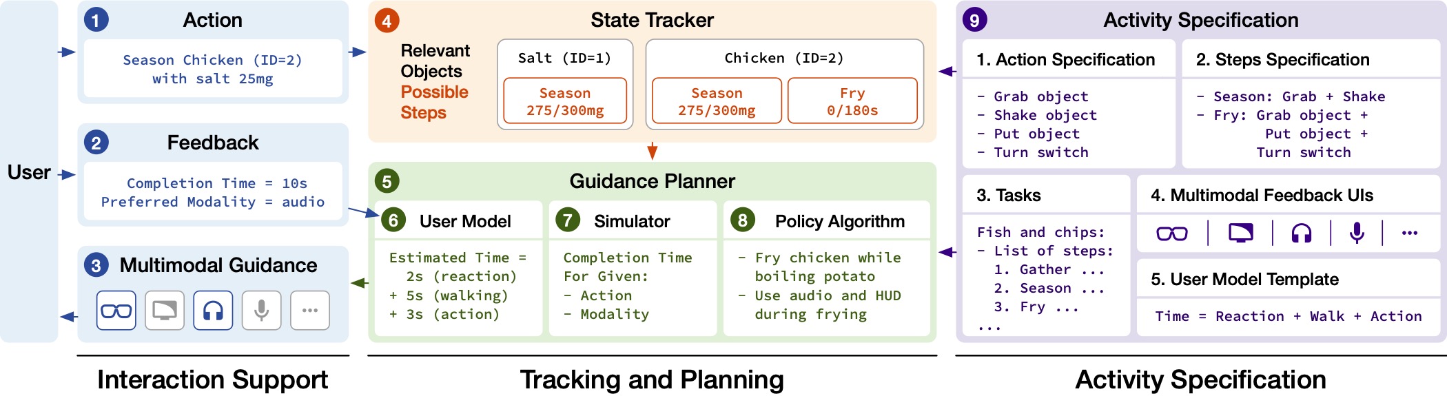 - Activity Specification: Developers provide a specification of the activity domain, including action types, step types, tasks, multimodal feedback UIs, and a user model template.