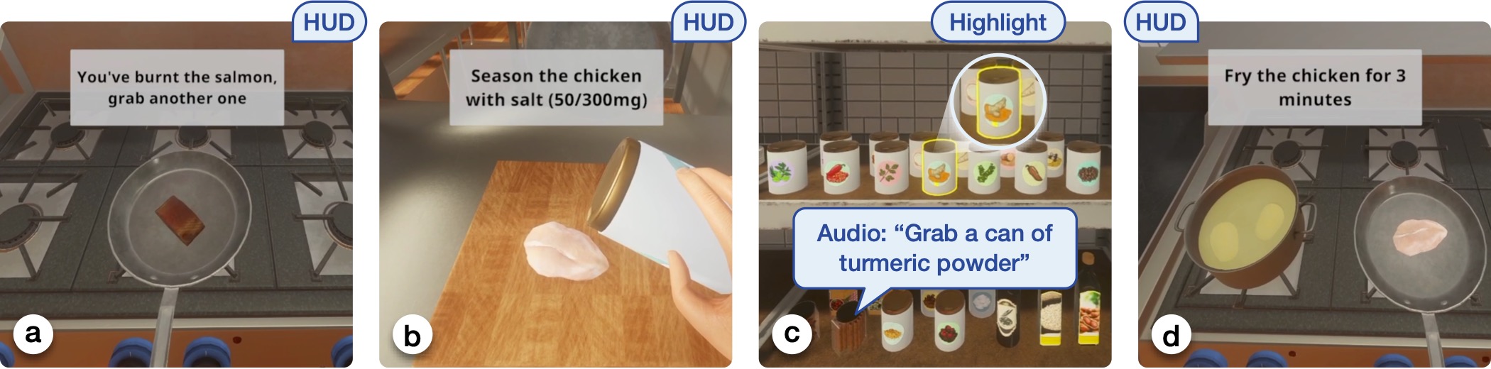 To demonstrate the effectiveness of AMMA, we built a cooking assistant running in a high-fidelity virtual reality (VR) simulator. The cooking assistant adapts its guidance and communication modalities based on the user’s progress, preferences, and capabilities. We conducted a user study with 12 participants to evaluate the cooking assistant. The study protocol involved a training session, a personalization session to train the user model, and two experimental sessions comparing AMMA with a baseline system.