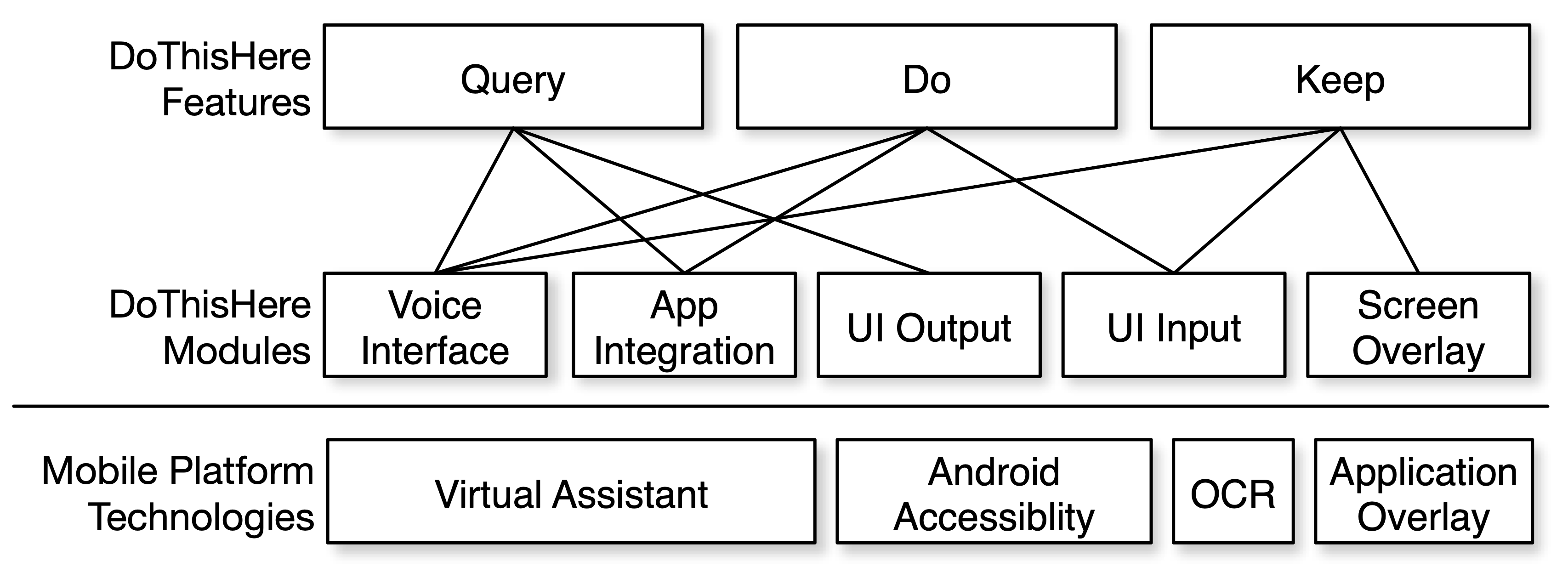 As the DoThisHere concepts deal with interactions between apps, they need to be incorporated at the operating system level. We leverage existing technologies on mobile platforms so that DoThisHere can work with existing apps without modification.