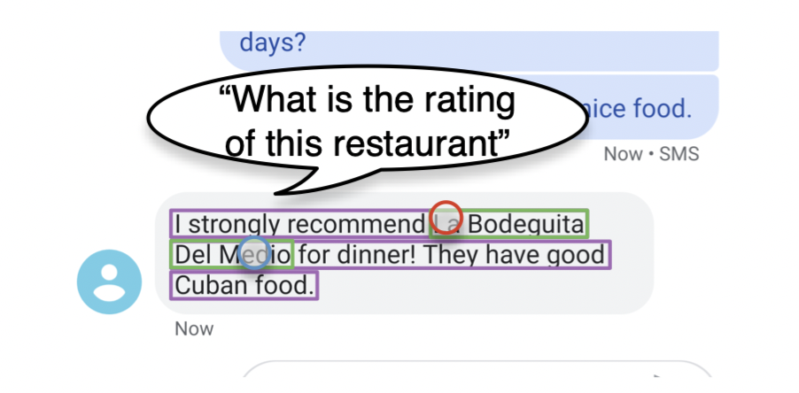 When DoThisHere detects the user’s drag movement started from one text area (shown in purple) and ended in the same text area, we use another selection method that is more natural for text selection. We treat the start and the end touchpoints as the beginning and the end of the text selection (shown in green boxes) and extract that text for the executed command.