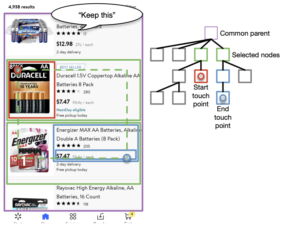 To support the selection of UI elements, we try to emulate the experience of selecting multiple items in a visual design app such as Figma or Keynote. DoThisHere gets the hierarchy of the UI elements on screen from the Android Accessibility API. The user can create a bounding box by dragging from one position to another, and all the elements intersecting with that bounding box will be selected. To make this process less error-prone, DoThisHere first finds the common ancestor (purple box) and then selects all the nodes (green box) that are direct children of that ancestor who have intersected with the selection box. See more about the rationale behind this in our paper.